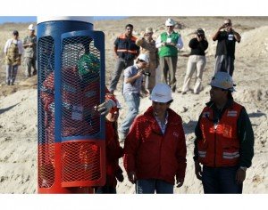A worker tests a capsule that will be used as part of rescue operations at the camp for the miners’ relatives at the San Jose copper and gold mine where 33 miners are trapped since an accident on August 5, as Chile’s Mining Minister Laurence Golborne (2nd R) looks on, near Copiapo, some 725 km (450 miles) north of Santiago, September 25, 2010. REUTERS/Ivan Alvarado